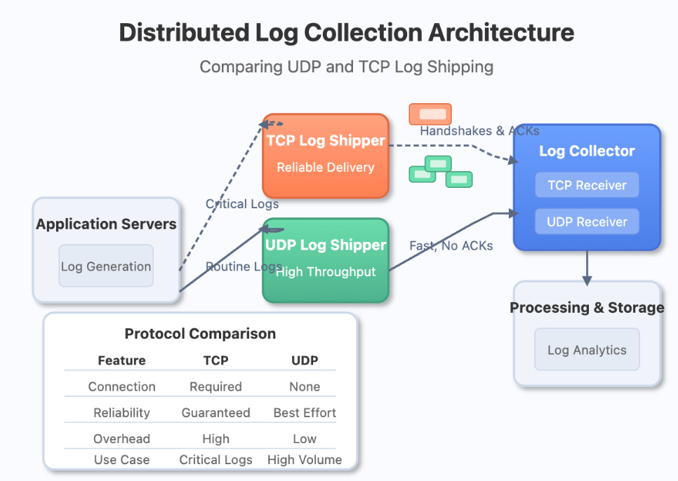Welcome to Day 10 of our distributed systems implementation journey! In our previous lesson, we created a TCP-based log shipping client that forwards logs from one machine to another. Today, we're taking our log collection system to the next level by adding UDP support for high-throughput log shipping.