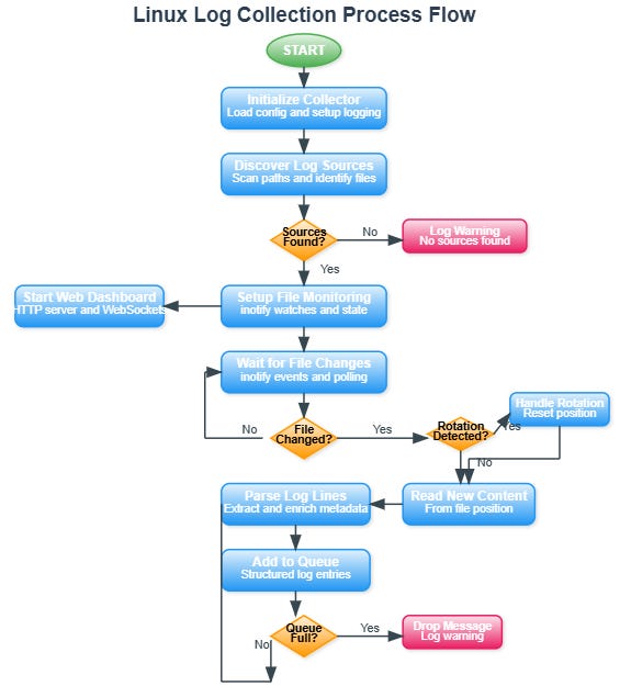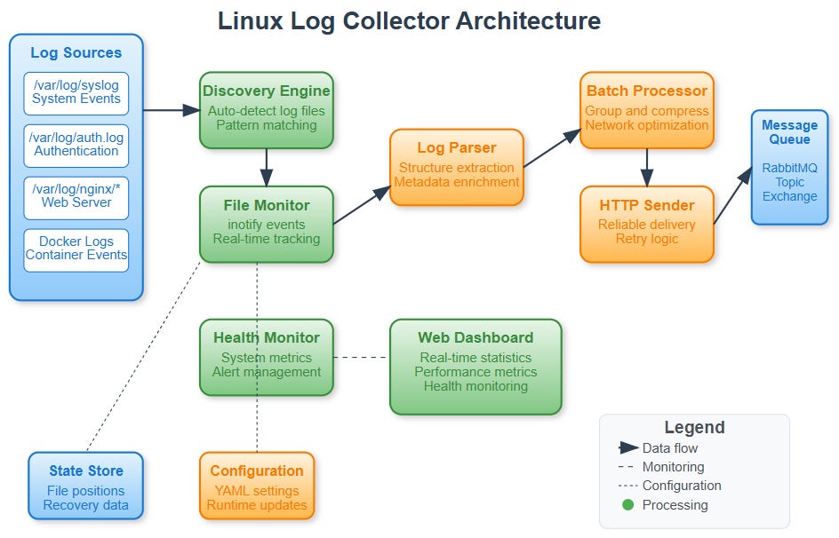 This collector provides the foundation for enterprise-scale log processing, handling the complexities of Linux system integration while maintaining reliability and performance standards required for production environments.