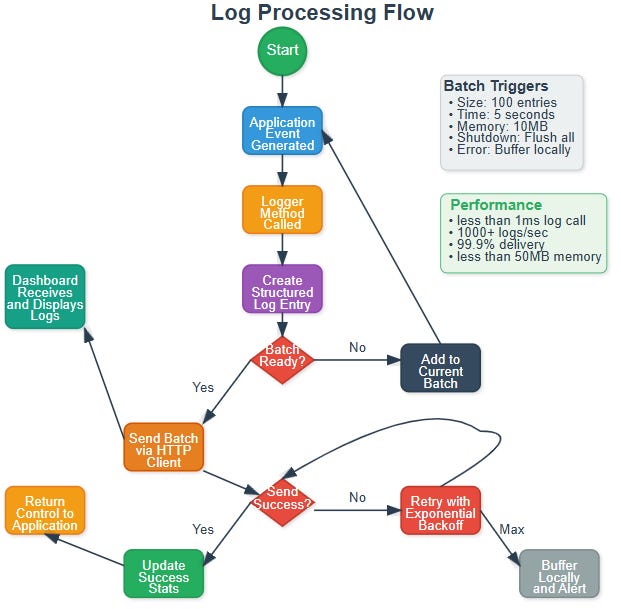 Error Handling: Failures don’t throw exceptions to the application. Instead, they trigger retry logic with exponential backoff (1s, 2s, 4s, 8s...). After maximum retries, logs buffer locally for later transmission.