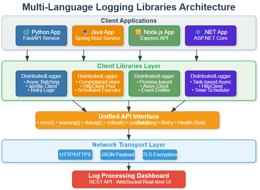 Your libraries solve this by hiding complexity. Developers call simple methods like logger.info() and your library handles batching, retries, connection pooling, and error recovery. The application never blocks waiting for logs to send, and no logs get lost even when your processing system is temporarily down.