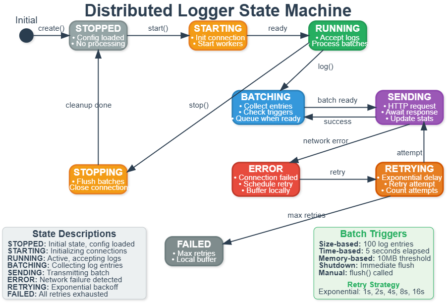 Batching Strategy: Your logger maintains a current batch that grows until reaching size limit (100 entries) or time limit (5 seconds). When triggered, it moves to a queue for processing. This decouples log collection from transmission.