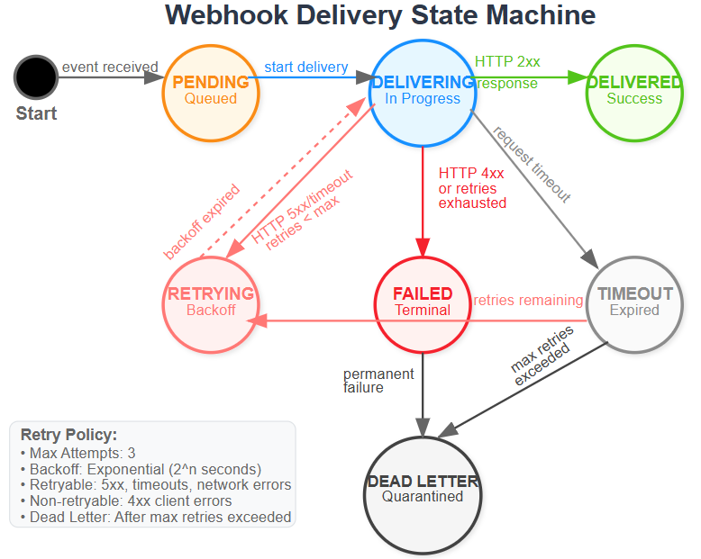 Webhook deliveries progress through defined states: pending, delivering, delivered, failed, retrying. Each state transition triggers appropriate actions - successful deliveries update metrics, failures initiate retry sequences, and exhausted attempts generate alerts.