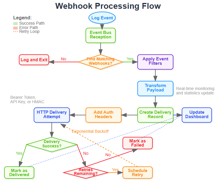 process_event(): Match events to registered webhooks_matches_filters(): Evaluate event against filter criteria_create_delivery(): Generate delivery records with transformed payloads_deliver_webhook(): HTTP delivery with authentication and retry logic