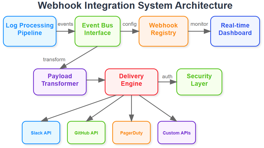 Event Bus Interface: Connects to your existing log processing pipeline, receiving processed log events and routing them to appropriate webhook handlers based on configured triggers.