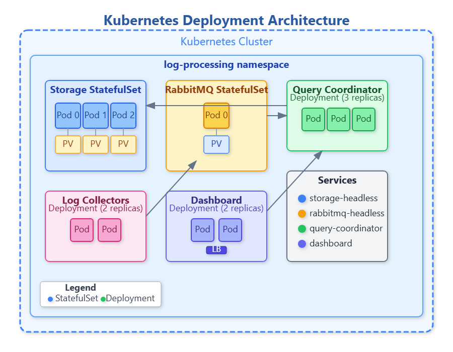 You’ve spent months constructing a sophisticated distributed log processing system—collectors ingesting data, RabbitMQ routing messages, query engines processing natural language requests, storage clusters maintaining consistency. Today, you’ll learn to deploy this entire ecosystem using Kubernetes, transforming your collection of services into a resilient, self-healing production platform.