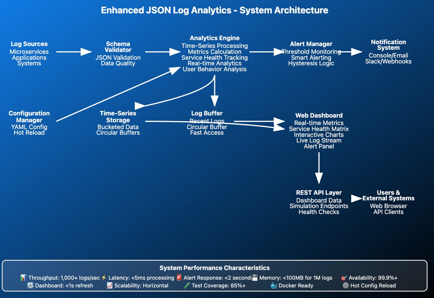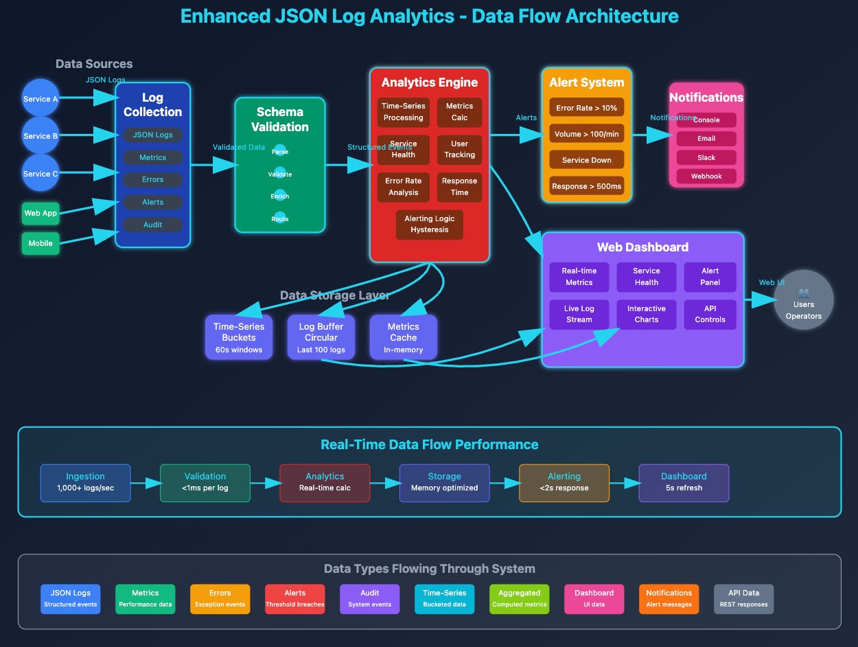 We're adding a JSON Processing Layer between your existing TCP/UDP receivers and storage. This layer deserializes incoming JSON, validates against predefined schemas, enriches the data, and forwards valid logs while rejecting invalid ones.