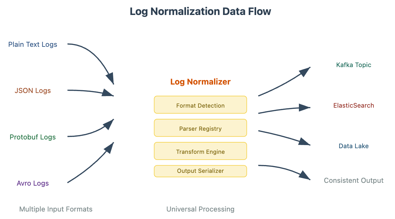 This exact challenge exists in distributed systems when dealing with logs. Your web servers might generate logs in plain text, your mobile apps send JSON logs, your microservices use Protobuf for efficiency, and your data analytics team prefers Avro for schema evolution. Without a normalization system, you'd have chaos - different parsing logic for each format, inconsistent data processing, and a maintenance nightmare.