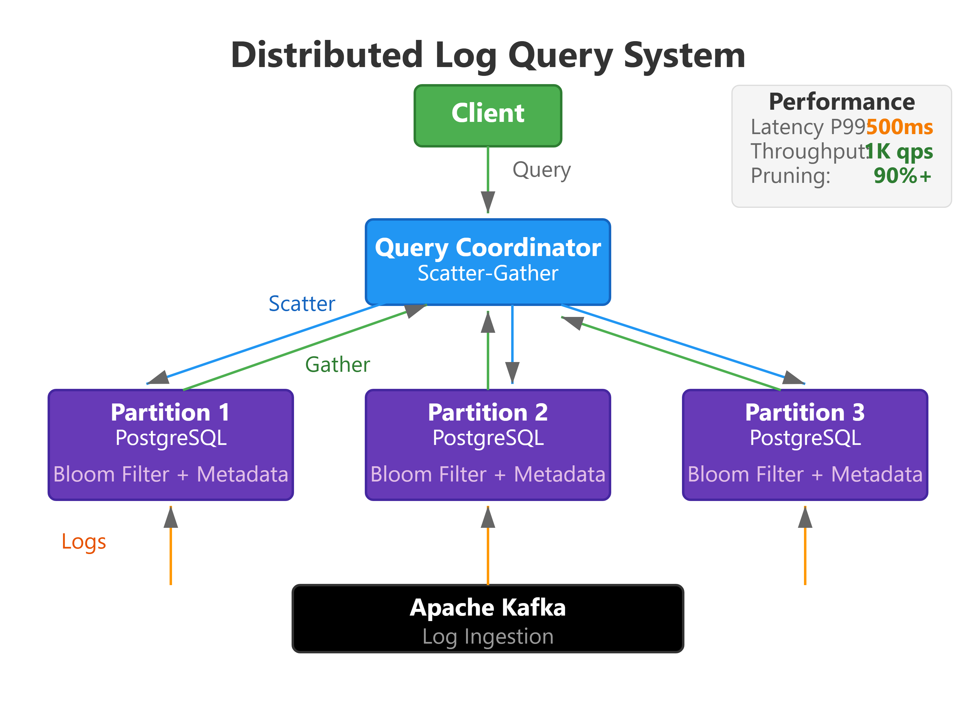 Why This Works: Most queries have high selectivity—they match only a small fraction of total logs. By pruning partitions early and executing in parallel, we scan only relevant data. A query that would take 60 seconds serially across 30 partitions completes in 2-3 seconds with parallel execution, bounded by the slowest partition (tail latency problem).