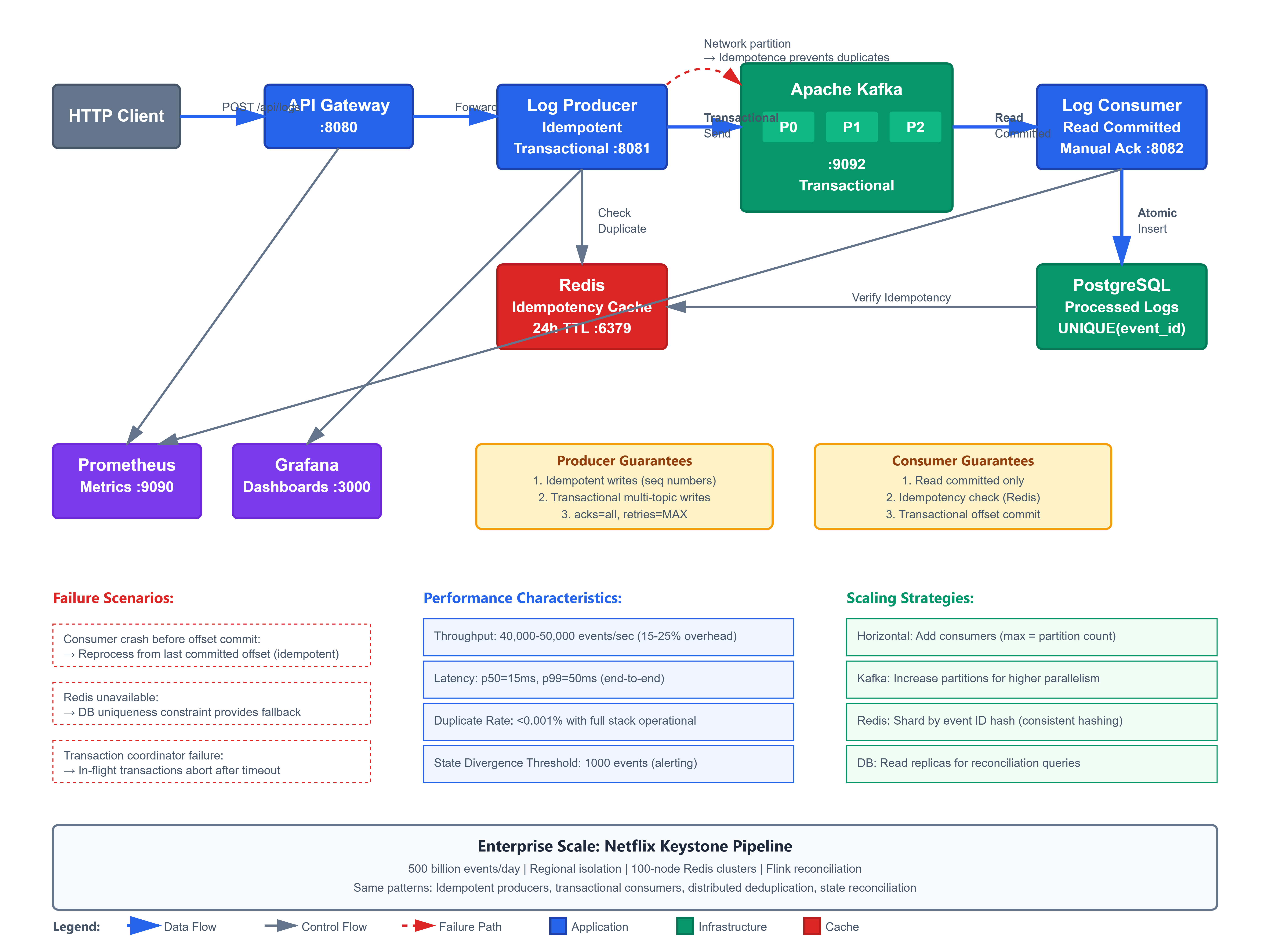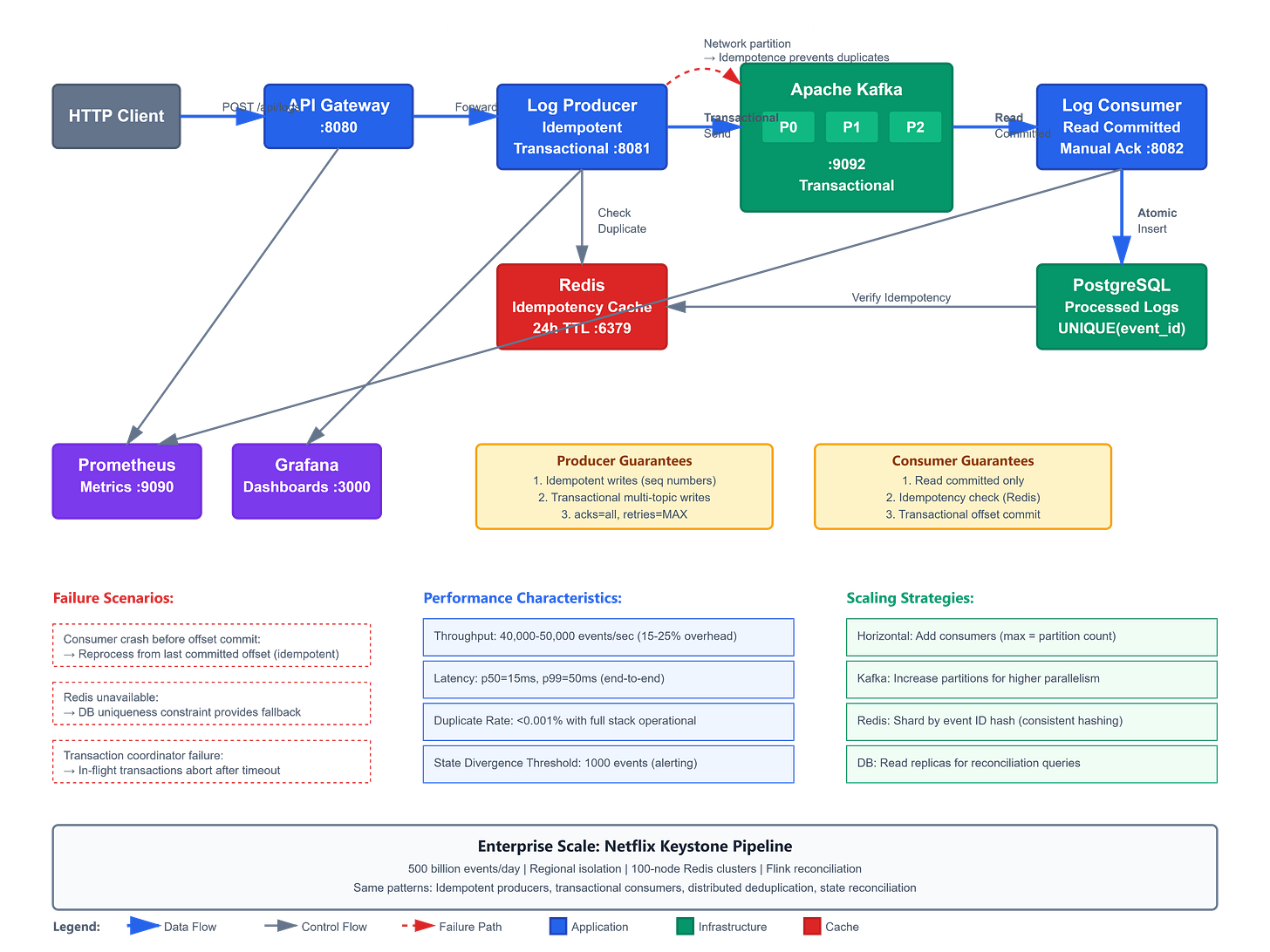 The root cause wasn’t Kafka. It was the absence of exactly-once semantics. Without idempotent producers, network retries created duplicate messages. Without transactional consumers, offset commits happened before database writes, causing reprocessing on crashes. Without deduplication, the same payment ID was processed multiple times.