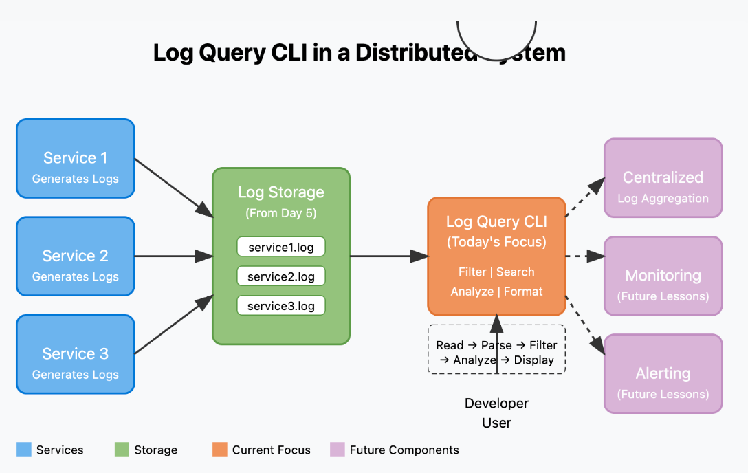 Welcome to Day 6 of our distributed systems journey! Today, we're going to build a powerful command-line tool that will help us search and filter through our logs. This might sound simple, but it's a critical piece of any robust distributed system. Let's explore why this matters and how to build it.
